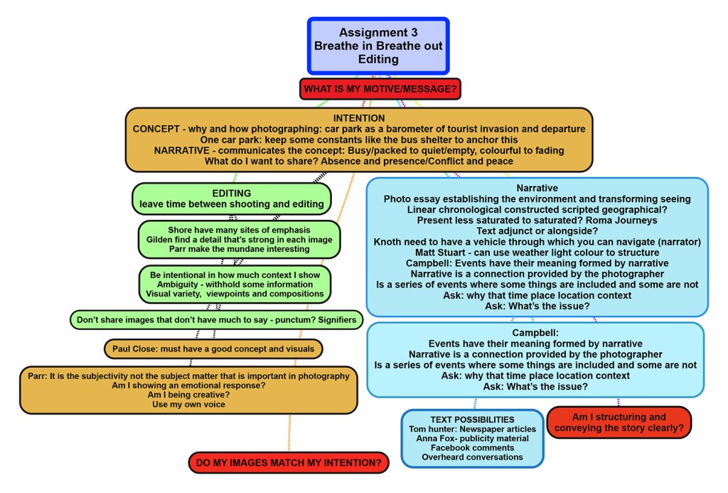 I described how this work is a progression from my assignment 3 work which identified the pressures of the rise in visitors to the town during the summer season, exemplified by the increased traffic in a car park. This work is of a much wider scope; assignment 3 was connotative of the issues, this expanded work allows me to denote more fully the concerns and issues arising from this phenomenon.