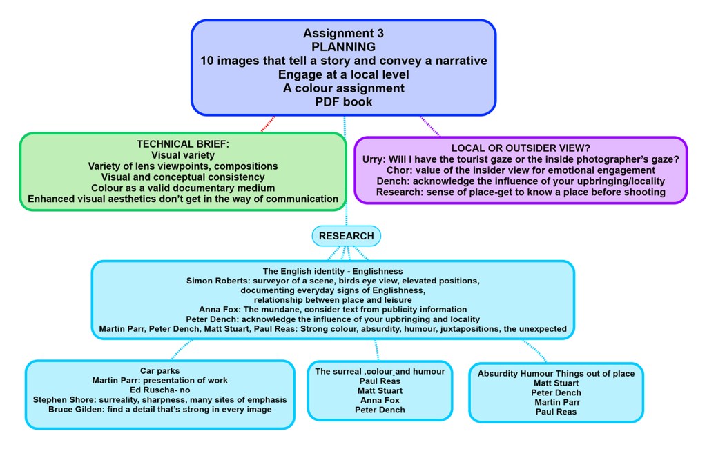 I reflected and fed my learning from my coursework and research into my work and was able to share my work with various OCA peer groups as it developed; this is evidenced in my learning log. As well as the research I have mentioned I was affected by that I did on senses of place Alex Webb, Mikael Subotzy, Marco Van Duyvendik, Laurel Chor, and Hannah Reyes Morales who underlined the importance of knowing a place well to capture it effectively. I also visited photographer’s work which though interesting was not relevant to my project though a similar subject matter such as Stephen Shore, Brice Gilden, Ed Ruscha and Martin Parr’s “Parking Spaces”; all research as an influence but it’s knowing which to discount as well as be led by.