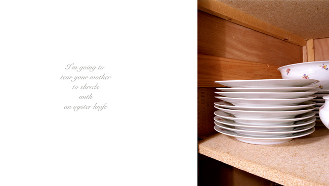 This was originally designed as a miniature book using images and texts with “My Father’s words” as a way of narrating about family relationships. The juxtaposition of her Father’s harsh words next to her mother’s collection of ordinary household objects in her cupboards forms an intimate sharing of her family life. Fox describes her work as “Colour photographs of my mother’s tidy cupboards together with excerpts from my father’s rantings” (Fox, 1999).