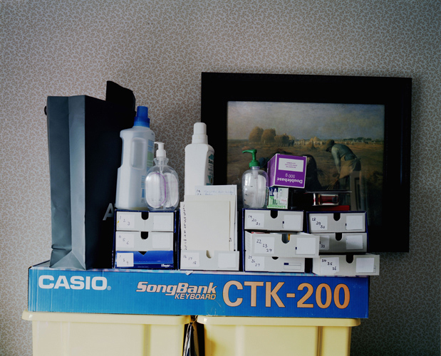 I am particularly interested in how Fox has framed the objects in the cupboards; it seems that they are all portrait orientated and shot from a slight angle including either a shelf or the floor each time and mostly a part of the cupboard roof interior. I notice that in her work “Cockroach diary”(Fox, 2000) she similarly maintains the same perspective in each shot (this time a downwards, squeeued perspective).